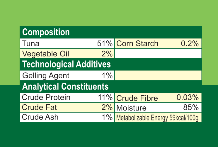 Tuna: Excellent choice for a high-quality protein and low-fat fish. Rich in Omega-3 (EPA & DHA), helps neural, brain, retinal and foetal development in addition to improve skin and coat condition.
